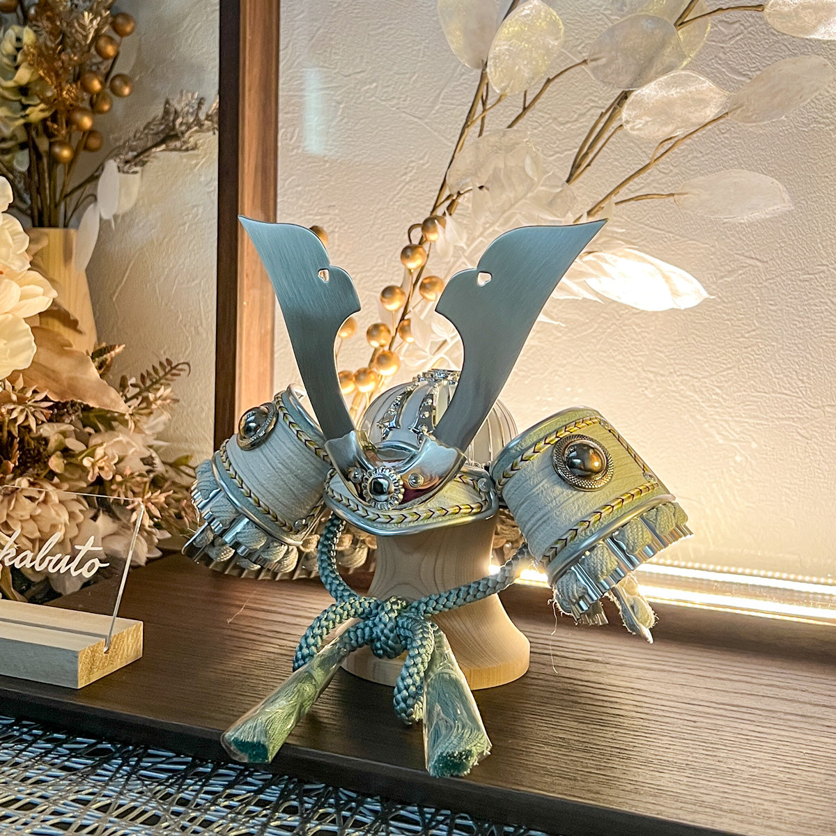 横幅25cm|コンパクトケース飾り|ターコイズブルーの五月人形| 水色 モダンなデザイン|コンパクト おしゃれ 兜鎧飾り 端午の節句飾り かぶと