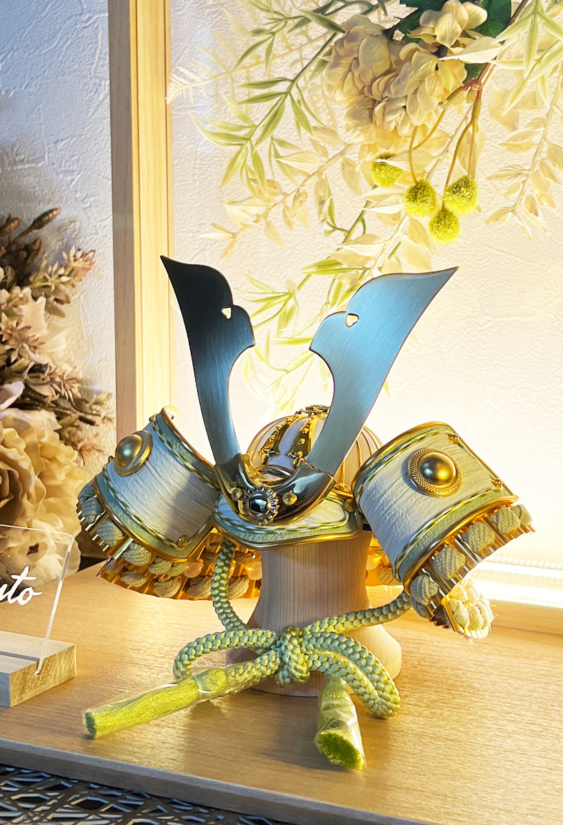 横幅50cm 五月人形 収納兜飾り|8号くすみ色緑| 武将 伊達政宗|モダン ナチュラル |勇敢で教養高い|コンパクト おしゃれ 兜鎧飾り 端午の節句飾り こどもの日 5月人形 人気 かぶと